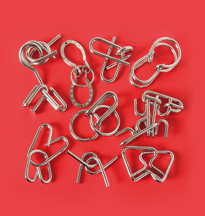 Deze set bevat maar liefst 10 metalen puzzels. Haal de onderdelen uit elkaar en breng ze daarna weer terug naar de startpositie. Elke set bevat een spiraalpuzzel, spijkerpuzzel, kleine gegoten puzzel, etc. Zo is er voor ieder wat wils. Ook zijn er verschillende niveaus te vinden in elke box: 1x *** moeilijkheidsgraad, 4x ** moeilijkheidsgraad 5x * moeilijkheidsgraad.