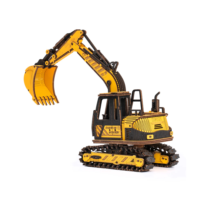 Dieses Baggermodell wurde nach dem Vorbild echter Bagger entworfen. Es ist ein perfektes pädagogisches 3D-Puzzle-Spielzeug aus Holz für Fahrzeugliebhaber und Mechaniker. Wir sind sicher, dass Sie, wenn Sie diesen Bagger fertiggestellt haben, ein breites Lächeln auf Ihrem Gesicht haben werden. Robotime hat das in der Tat sehr detailliert beschrieben. Die Hydraulik dieses Giganten ist bis ins kleinste Detail ausgeklügelt. Die Schläuche am Baggerarm dieses Miniaturbausatzes sind allerdings wirklich aus Holz, auch wenn man das nicht vermuten würde. Dieser Bagger ist ein Schmuckstück aus der Serie ‚Engineering Vehicle Models‘, denn neben den Rohren sind auch Teile wie die Hydraulikzylinder, das Auspuffrohr und im Führerhaus der Sitz mit den Lenkhebeln zu sehen. Besonders lustig: Er kann fahren und der Arm mit der Schaufel kann sich bewegen!