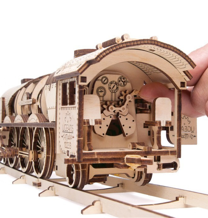 Ein wichtiges Symbol der industriellen Revolution ist die Dampflokomotive mit Kohlenwagen. Die detaillierte Konstruktion des VM-Express mit beweglichen Details: Zahnräder, ein Schwungrad, die Arbeit des Zylinder-Kolbens. Der Kohlewagen hat eine Klappe, die man mit einem kleinen Riegel schließen kann. Natürlich wird auch dieses Modell von einem Gummimotor angetrieben.