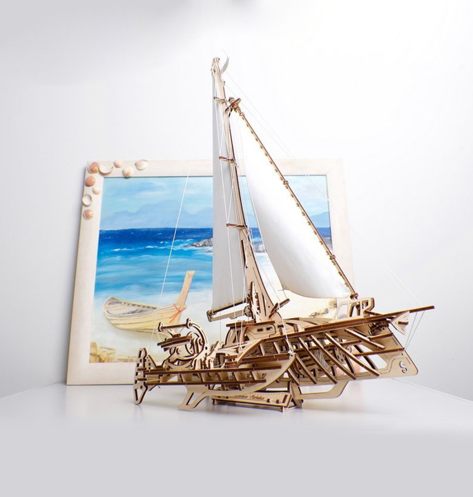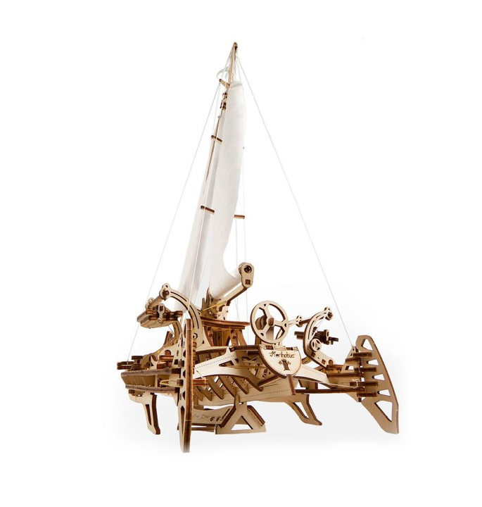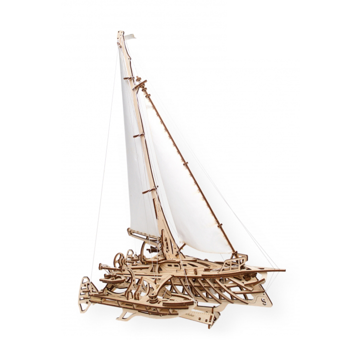 Lassen Sie sich vom Wind tragen und segeln Sie mit dieser außergewöhnlich anmutigen Meeresschönheit davon. Der Trimaran Merihobus von UGears ist anmutig und stilvoll. Es ist mit vielen Details wie Winden, Takelage und Rümpfen ausgestattet, was es zu einer sehr realistischen Miniaturkopie eines echten Prototyps macht. Da die Karosserie wie ein Skelett aufgebaut ist, können Sie sehen, wie der Mechanismus wirklich funktioniert. Das Modell wird mit mehreren Flaggenvorlagen geliefert, so dass Sie Ihr eigenes Design gestalten können.