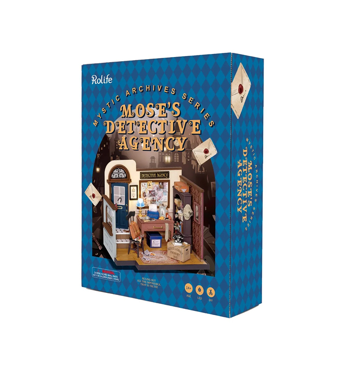 Het is al laat in de nacht, een bekend figuur onderzoekt de zaak nog… Detectivebureau Moss zal de schuldigen veroordelen! Dit miniatuur huisje is onderdeel van de Mystic Archives Series van Rolife Robotime. Dit keer presenteren we… het detectivebureau van Sherlock Holmes, eh, nou ja, van Mose, maar die denkt dat hij Sherlock is! Gewoon té leuk. De details zijn weer ge-wel-dig. Sherlock is even buiten de deur en in zijn chaotische leven is hij weer van alles vergeten. Hij is zijn Burberry hoed en stropdas vergeten. Hij zal de tijd niet weten, want zijn zakhorloge ligt nog op het antieke bureau. Ook zal hij geen vingerafdruk kunnen bekijken, aangezien zijn loep nog binnen ligt. Hij zal vast snel terugkomen, want op het prikbord heeft hij zijn aanwijzingen staan die verbonden zijn met draadjes om verbanden te leggen. Op zijn antieke ’typmachine’ gaat hij zijn rapport tikken en hij zal wel weer mopperen als zijn retrotelefoon rinkelt.