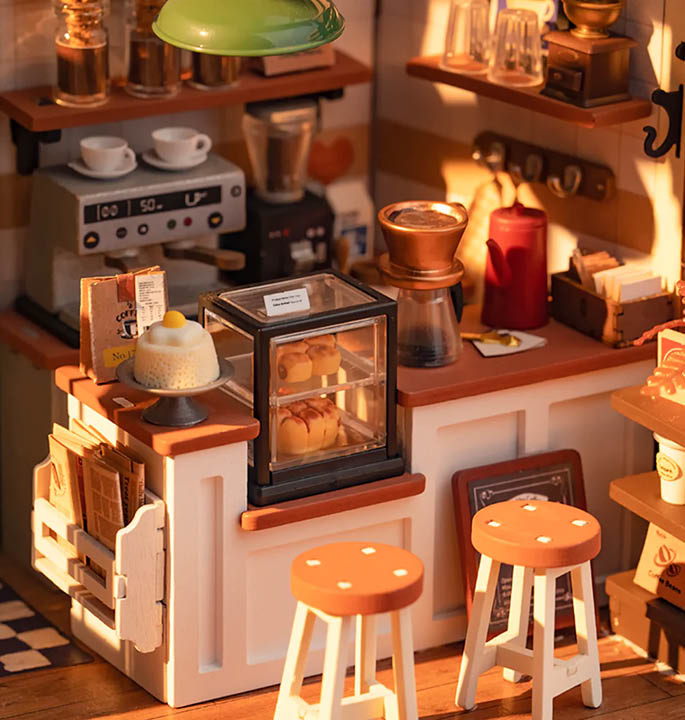 Stap binnen in de betoverende wereld van het Robotime Café Miniature Coffee House en laat je meevoeren door een warme, nostalgische sfeer. Het voelt als een luxe koffiebar waar je helemaal tot rust komt, kunt genieten en je kunt onderdompelen in een vleugje retro-charme. Geïnspireerd door klassieke koffiezaken zit dit miniatuurhuisje vol mooie houten details die de ruimte een gezellige, uitnodigende uitstraling geven.