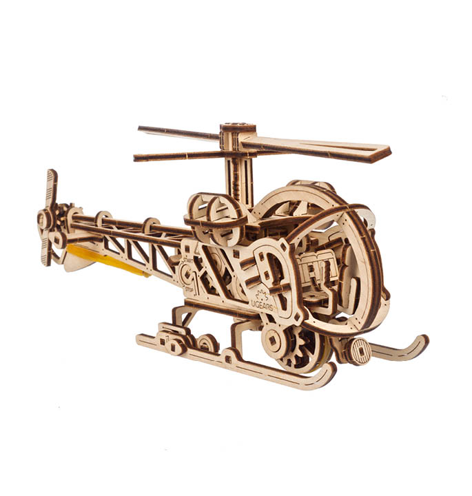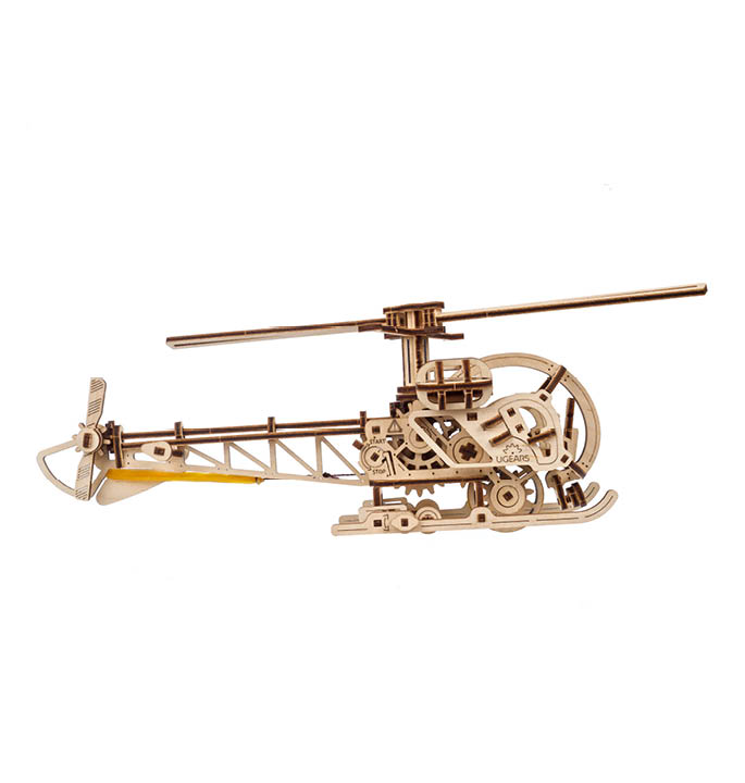 Deze Mini-helikopter is een uniek model in de Smart-collectie van Ugears. Met zijn open ontwerp kun je alle onderdelen van deze zelfbouw helikopter model zien. Deze 3D-puzzel zit vol met realistische details, zoals een draaiende rotormast, hoofdrotor en staartrotor, tweezits cockpit, deuren die open kunnen, verstelbaar zoeklicht, intrekbare achterwielen, landingssloffen en een helikopterplatform waarop het model kan rusten. Dit is een echt realistische modelbouw voor echte helikopterfans!