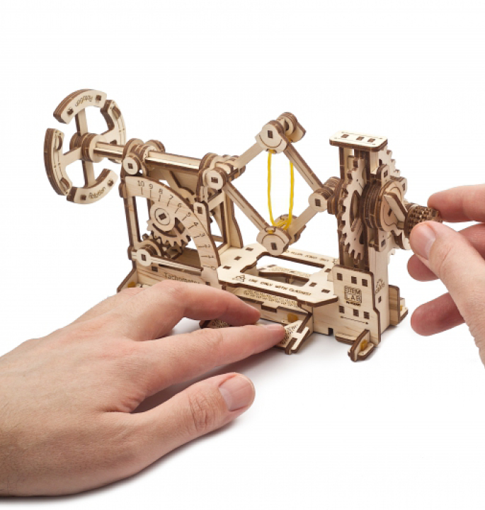 De Tachometer 3D-puzzel uit de STEM Lab-collectie van UGEARS is een volledig operationeel doe-het-zelf houten model van een toerenteller, klaar om in elkaar te zetten. Wanneer aan de hendel wordt gedraaid, wordt de beweging overgebracht, waardoor het toerental wordt verhoogd en de dubbele gewichten in de centrifugaal eenheid worden verplaatst. Hoe hoger het toerental, des te meer middelpuntvliedende kracht de gewichten verplaatst en een beweegbare as naar het vliegwiel beweegt. Een wijzerplaat is op de as bevestigd; hoe meer de as verschuift (hoger toerental), hoe meer de pijl van de wijzerplaat afbuigt, wat wijst op een hogere rotatiesnelheid.