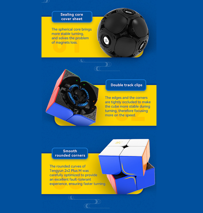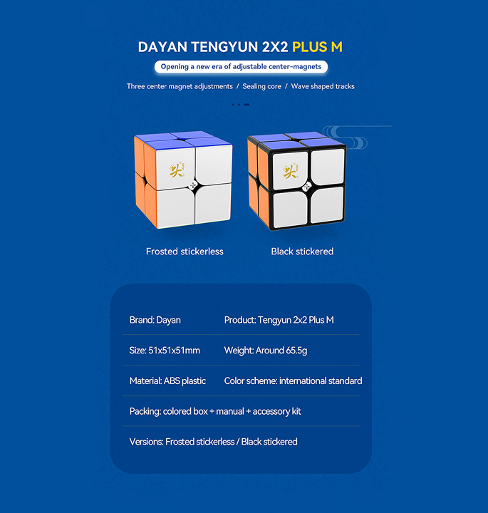 De DaYan TengYun Plus 2×2 M bevat nieuwe upgrades ten opzichte van de DaYan TengYun 2×2. Deze cube bevat verstelbare magneten (3 sterktes). Aanpassing van de magneten zijn snel en eenvoudig. Gebruik het meegeleverde gereedschap om de middelste “hex” met de klok mee te draaien om te kiezen tussen instelling 1, 2 of 3. Instelling 1 = Sterk magnetisch gevoel, instelling 2 = Matig magnetisch gevoel en instelling 3 = Licht magnetisch gevoel.